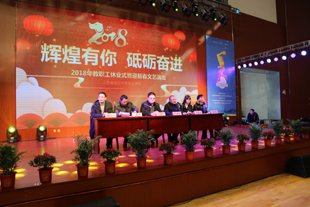 学校党总支书记、校长卞勇平在演出开始前发表了热情洋溢的新年致辞。在贺词中卞校长回顾了2017年学校取得的各项成绩,并代表学校党总支、行政向辛勤工作、默默耕耘在教学、科研、管理、服务岗位上的全体教职员工表示诚挚的问候,向全校师生致以新年的祝福,对学校的发展前景表达了最美好的祝愿!2018年,学校将在上级部门的领导下,认真贯彻落实党的十九大精神,围绕学校“十三五”规划确定的目标任务,以新校区建设、智慧校园建设、现代化示范校建设三大创建任务为抓手,持续深化产教融合、校企合作,增强人才培养与产业发展的契合度,彰显办学特色,打造职教品牌,进一步提高人才培养质量,更好地服务地方经济发展。
