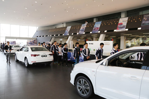 4月3日下午,我校汽车运用与维修专业的200余名同学,在社区培训处陈云东副处长、机电部黄火俊主任、汽修实训老师和各班班主任的带领下,徒步2.2公里,来到位于南环二路的金坛汽车城,走进福特、大众、奥迪等4S店参观学习,了解行业发展状况,近距离感受高端汽车品牌的企业文化与内涵。