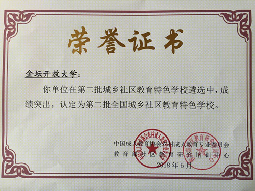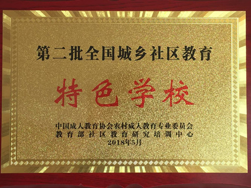 2018年6月5日,在全国城乡社区教育创新发展现场会上举办的第二批全国城乡社区教育特色学校授牌仪式上,我校荣获“第二批城乡社区教育特色学校”称号。