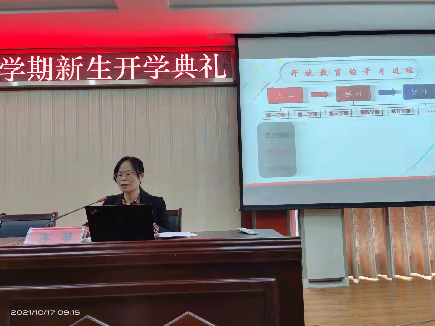继续教育学院负责人许琴就开放教育的学习形式、学籍政策、考核方式、学习平台使用等情况,对新生进行了细致的入学教育。