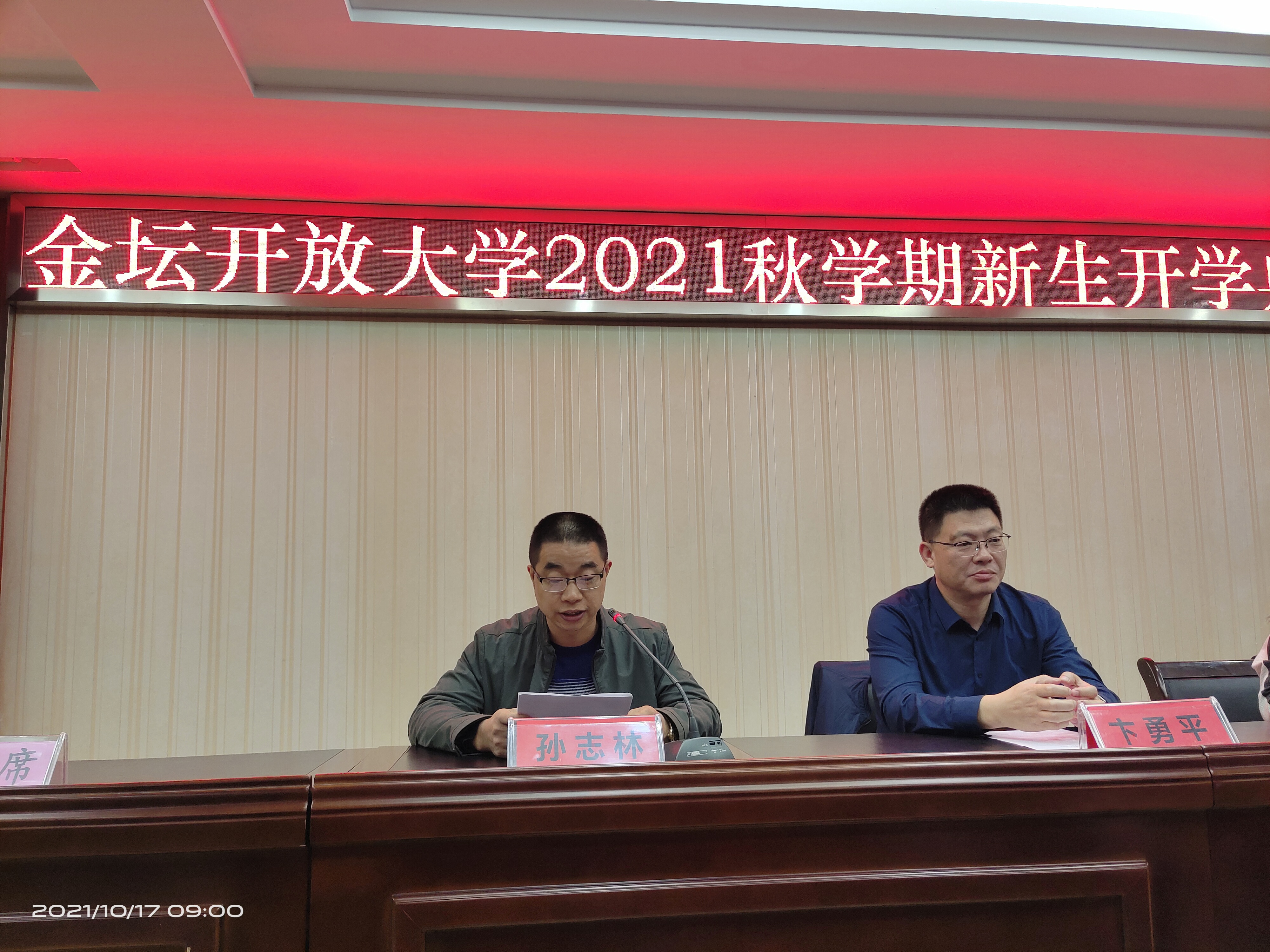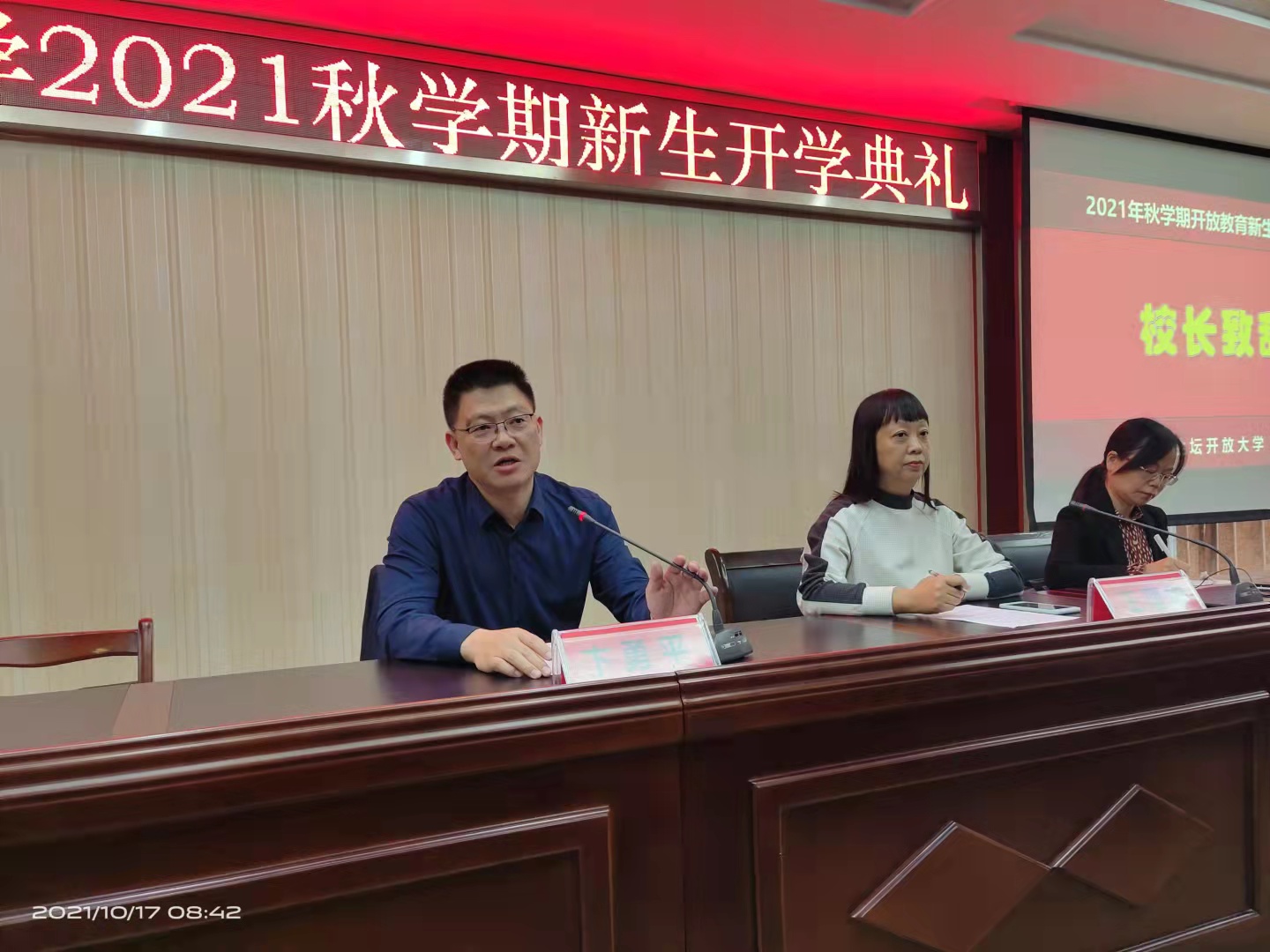 2021年10月17日上午,我校隆重举行21秋开放教育新生开学典礼。学校领导卞勇平、王理华, 21秋开放教育本专科全体新生以及相关班主任参加了开学典礼。活动由王理华副校长主持。